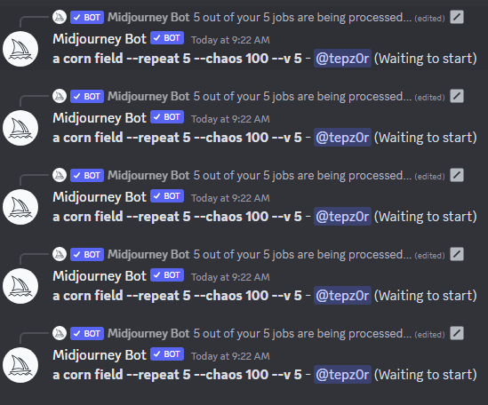 --repeat tells Midjourney to rerun the same prompt multiple times. Instead of copy–pasting the prompt, we ask Midjourney to do the repetition.