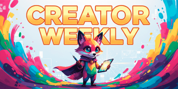 colorful banner with central character, bold title text that reads "CREATOR WEEKLY", clean background --stylize 80 --chaos 15