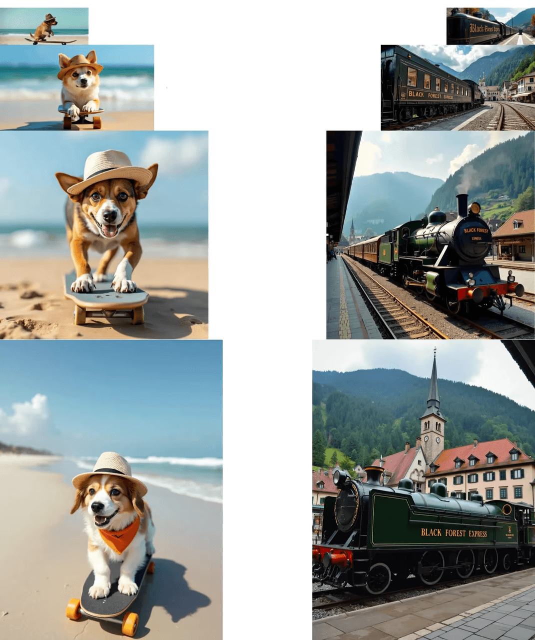 • For the prompt: "bold poster, ‘COASTAL CYCLE TOUR' in Futura Bold, teal and coral, grid layout," raising steps from 22 to 32 reduced character warping: the longer diffusion path helps stabilize letterforms.