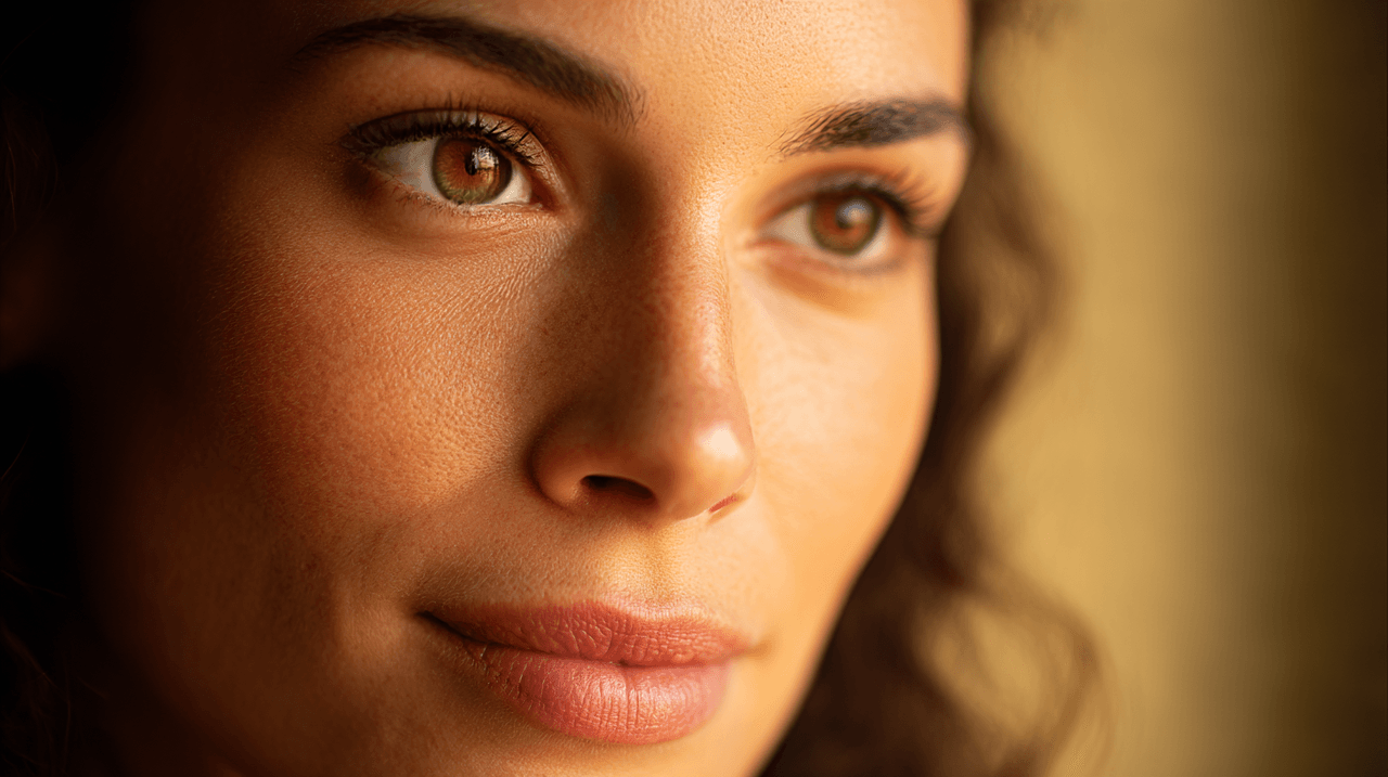Portrait of a woman with warm olive skin tone, fine texture detail, soft golden hour window light from left side, shallow depth of field, 85mm lens perspective, creamy bokeh background, professional studio atmosphere --ar 2:3 --s 120 --chaos 8
