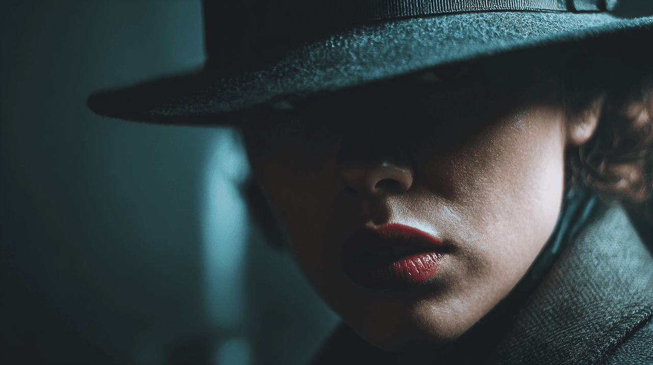 Technical detail: Split lighting creates dramatic contrast between the lit and shadowed sides of the face, essential for noir aesthetic.