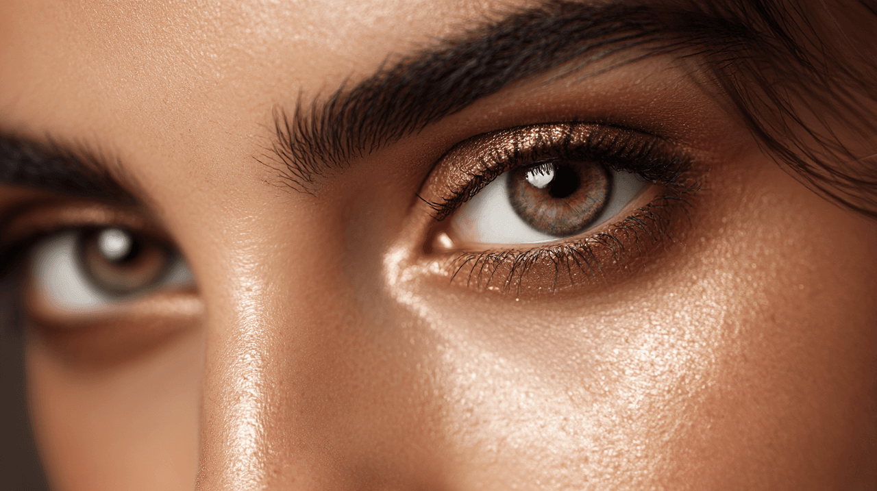 Extreme close-up beauty portrait, focus on eyes with visible iris detail and catchlight, flawless skin texture with subtle pores visible, professional beauty lighting, soft focus on background, shot with macro lens, f/2.8 aperture --ar 3:4 --s 100 --chaos 5