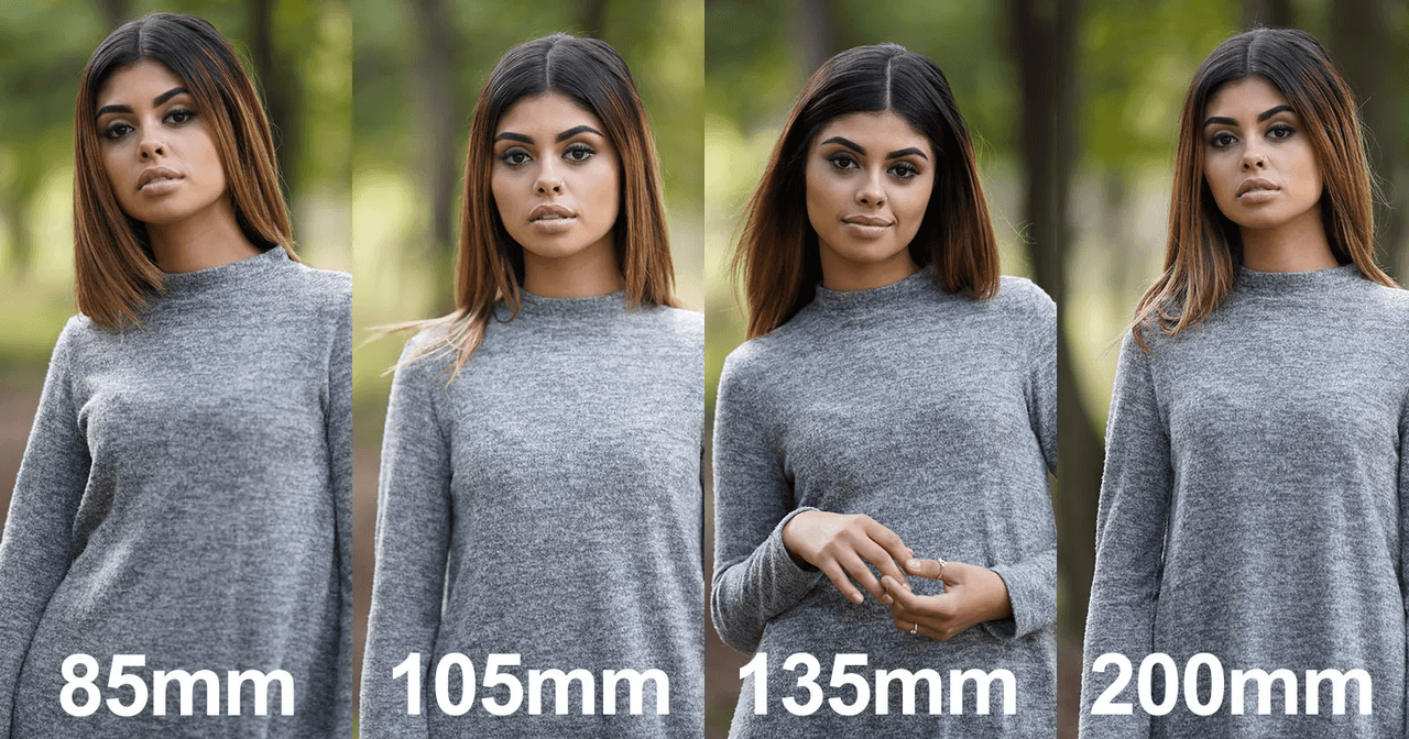 Wide lenses (24–35mm) exaggerate noses and foreheads, especially up close. That distortion reads as "off" even if you don't consciously see why.