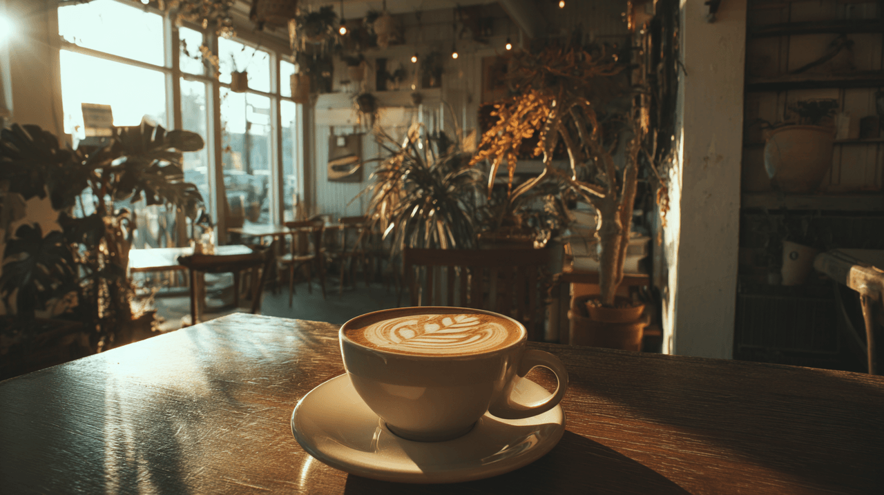 /imagine prompt: cozy coffee shop interior, morning sunlight through large windows, barista preparing latte art, warm and inviting atmosphere --ar 16:9 --v 6